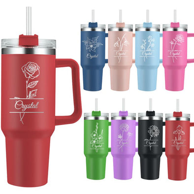 Personalized 40oz Tumbler with Handle and Straw, Custom Birth Flower Engraved Names Insulated Stainless Steel Travel Cup