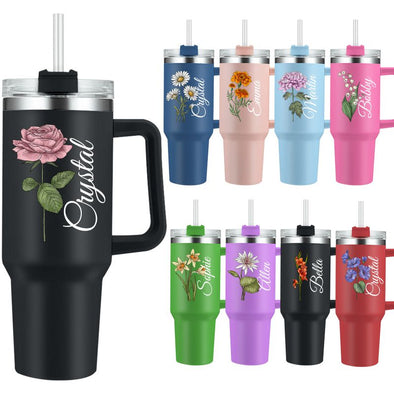 Personalized 40oz Tumbler with Handle and Straw, Custom Birth Flower Print Names Insulated Stainless Steel Travel Cup
